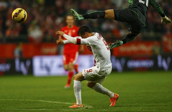 Robert Lewandowski of Poland collides with Switzerland's goalkeeper Roman Buerki (top) during their international friendly soccer match at Wroclaw Stadium in Wroclaw, November 18, 2014.KACPER PEMPEL/Reuters