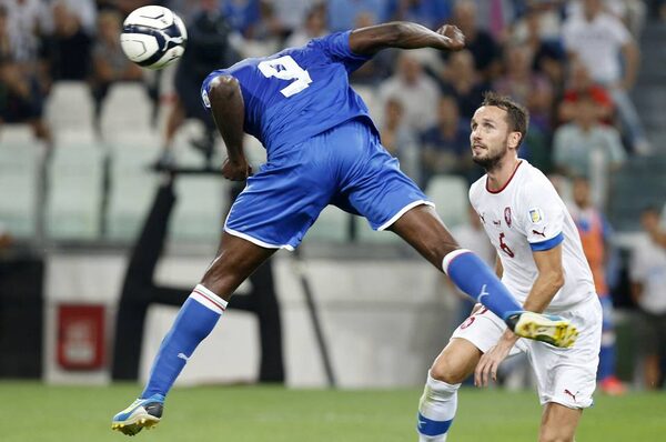 Italy's Mario Balotelli, left, heads the ball next to Czech Republic's Tomas Sivok during their 2014 World Cup qualifying soccer match at the Juventus stadium in Turin, September 10, 2013.Reuters