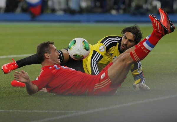 Russia's Aleksandr Kerzhakov, left, fights for the ball with Israel's goalkeeper Dudu Aouate during the World Cup group F qualifying soccer match between Russia and Israel in St.Petersburg, Russia, Tuesday, Sept. 10, 2013.Dmitry Lovetsky/The Associated Press