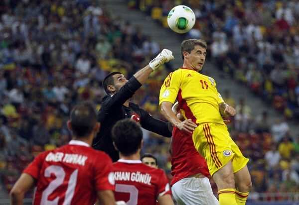Turkey's goalkeeper Volkan Demirel jumps for the ball with Romania's Bogdan Stancu during their 2014 World Cup qualifying soccer match at National Arena in Bucharest September 10, 2013.BOGDAN CRISTEL/Reuters