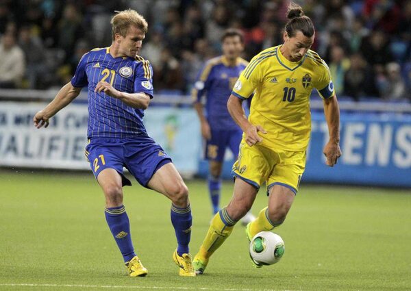 Kazakhstan's Valeri Korobkin, left, chases Sweden's Zlatan Ibrahimovic during their 2014 World Cup qualifying soccer match at the Astana Arena stadium in Astana September 10, 2013.SHAMIL ZHUMATOV/Reuters