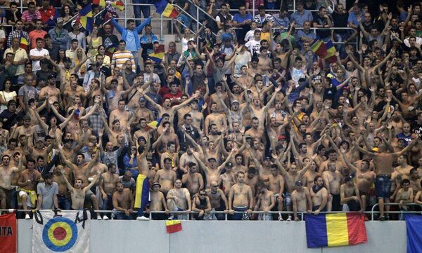Shirtless soccer fans of Romania cheer for the team during their 2014 World Cup qualifying soccer match against Turkey at the National Arena in Bucharest September 10, 2013.BOGDAN CRISTEL/Reuters