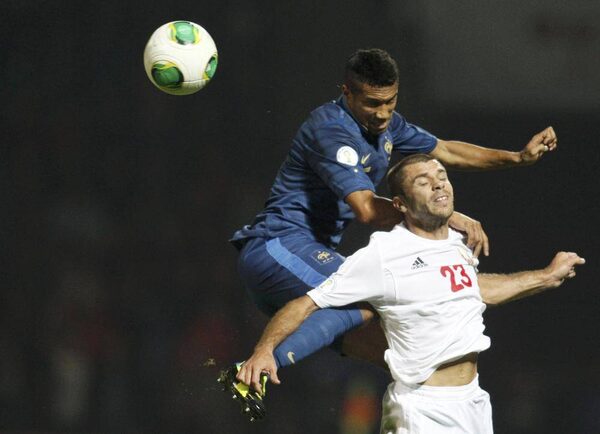 Belarus' Timofei Kalachev, right, goes for a header with France's Gael Clichy during the 2014 World Cup qualifying soccer match in Gomel September 10, 2013.VASILY FEDOSENKO/Reuters
