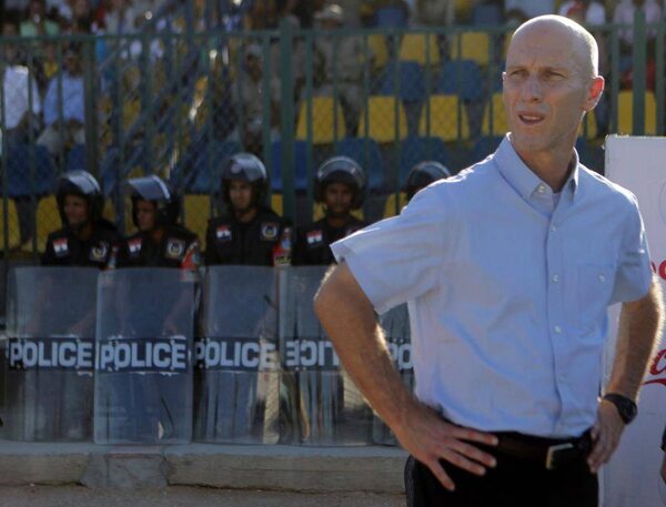 Egypt's head coach Bob Bradley of the U.S. stands in from of riot police during their 2014 World Cup qualifying soccer match against Guinea at El-Gouna stadium in Hurghada, about 464 km from the capital Cairo September 10, 2013.AMR ABDALLAH DALSH/Reuters