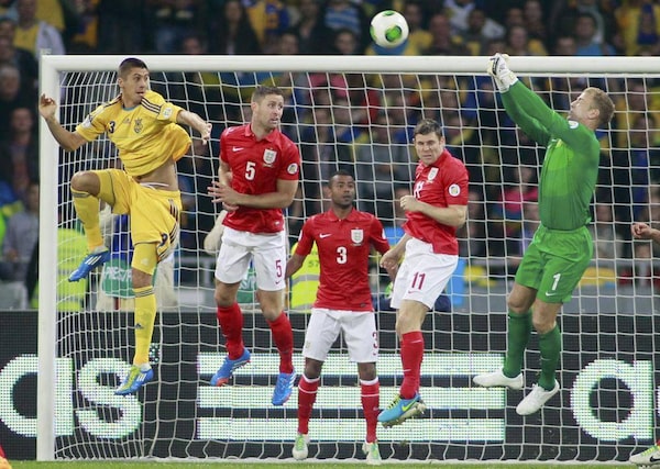 Ukraine's Yevhen Khacheridi, left, goes for a header with England's goalkeeper Joe Hart, far right, James Milner, Ashley Cole and Gary Cahill during the 2014 World Cup qualifying soccer match at the Olympic stadium in Kiev September 10, 2013.GLEB GARANICH/Reuters