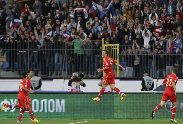 Russia's Alexander Kokorin, centre, celebrates his goal with team mates during their 2014 World Cup qualifying soccer match against Israel at the Petrovsky Stadium in St. Petersburg, September 10, 2013.ALEXANDER DEMIANCHUK/Reuters