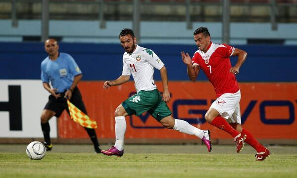 Bulgaria's Radoslav Dimitrov, centre, runs with the ball away from Malta's Clayton Failla before shooting to score a goal during their 2014 World Cup qualifying soccer match at the National Stadium in Ta' Qali, outside Valletta, September 10, 2013.DARRIN ZAMMIT LUPI/Reuters