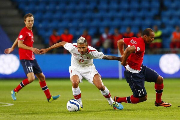 Switzerland`s Valon Behrami fights for the ball with Norway's Daniel Braathen during their 2014 World Cup qualifying soccer match in Oslo September 10, 2013.SCANPIX/Reuters
