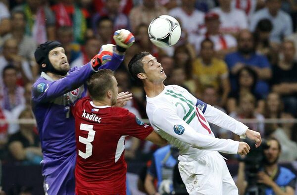Czech goalkeeper Petr Cech, left, Portugal's Cristiano Ronaldo, right, and Czech Republic's Michal Kadlec vie for the ball during the Euro 2012 soccer championship quarter-final match between Czech Republic and Portugal in Warsaw, Poland, Thursday, June 21, 2012.Antonio Calanni/The Associated Press