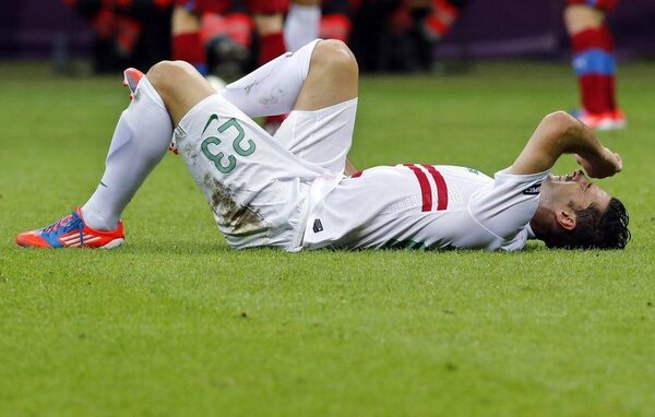 Portugal's Helder Postiga grimaces in pain after a hamstring injury during the Euro 2012 soccer championship quarter-final match between Czech Republic and Portugal in Warsaw, Poland, Thursday, June 21, 2012.Antonio Calanni/The Associated Press