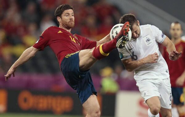 France's Yohan Cabaye, right, and Spain's Xabi Alonso go for the ball during the Euro 2012 soccer championship quarter-final match between Spain and France in Donetsk, Ukraine, Saturday, June 23, 2012.Ivan Sekretarev/The Associated Press