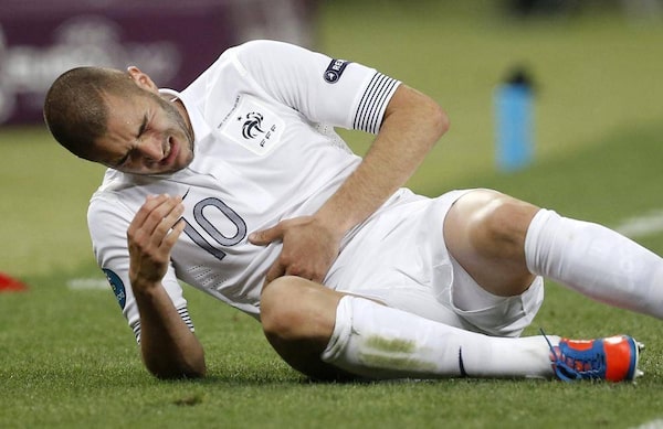 France's Karim Benzema grimaces in pain during the Euro 2012 soccer championship quarter-final match between Spain and France in Donetsk, Ukraine, Saturday, June 23, 2012.Laurent Cipriani/The Associated Press