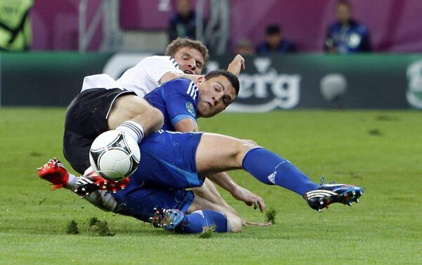 Germany's Thomas Mueller, left, and Greece's Kyriakos Papadopoulos fight for the ball during the Euro 2012 soccer championship quarterfinal match between Germany and Greece in Gdansk, Poland, Friday, June 22, 2012.Thanassis Stavrakis/The Associated Press