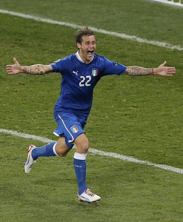 Italy's Alessandro Diamanti celebrates after scoring a winning penalty goal against England during their Euro 2012 quarter-final soccer match at the Olympic stadium in Kiev June 24, 2012.Michael Dalder/Reuters