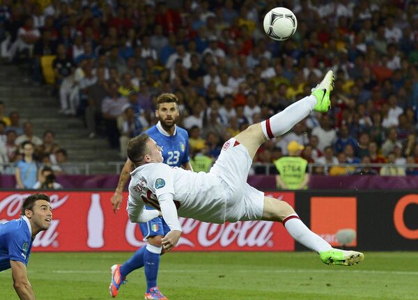 England's Wayne Rooney (C) fails to score with a bicycle kick during their Euro 2012 quarter-final soccer match against Italy at the Olympic Stadium in Kiev, June 24, 2012.Tony Gentile/Reuters