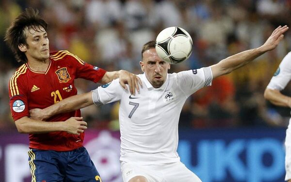 Spain's David Silva, left, challenges France's Franck Ribery during the Euro 2012 soccer championship quarter-final match between Spain and France in Donetsk, Ukraine, Saturday, June 23, 2012.Laurent Cipriani/The Associated Press