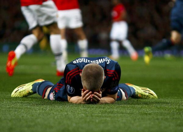 Bayern Munich's Bastian Schweinsteiger reacts during their Champions League quarter-final first leg soccer match against Manchester United at Old Trafford in Manchester, April 1, 2014.MICHAEL DALDER/Reuters