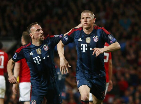 Bayern Munich's Bastian Schweinsteiger, right, celebrates with Franck Ribery after scoring a goal against Manchester United during their Champions League quarter-final first leg soccer match at Old Trafford in Manchester, April 1, 2014.MICHAEL DALDER/Reuters