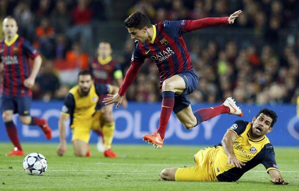 Atletico Madrid's Diego Costa and Barcelona's Marc Bartra fight for the ball during their Champions League quarter-final first leg soccer match at Camp Nou stadium in Barcelona April 1, 2014.GUSTAU NACARINO/Reuters