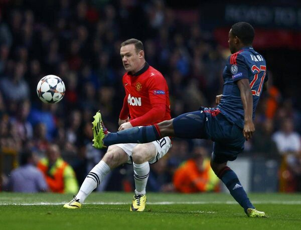 Manchester United's Wayne Rooney, left, fights for the ball with Bayern Munich's David Alaba during their Champions League quarter-final first leg soccer match at Old Trafford in Manchester, April 1, 2014.MICHAEL DALDER/Reuters