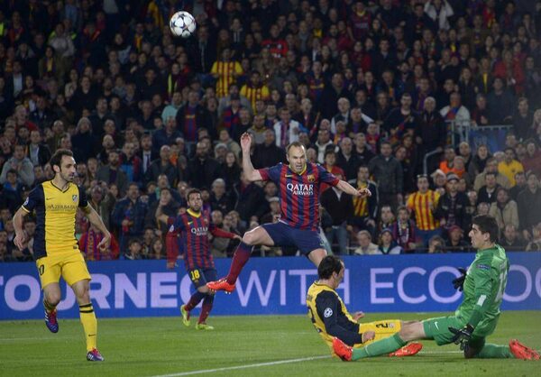 Barcelona's Andres Iniesta, centre, makes a challenge on goal during a first leg quarter-final Champions League soccer match between Barcelona and Atletico Madrid at the Camp Nou stadium in Barcelona, Spain, Tuesday April 1, 2014.Manu Fernandez/The Associated Press