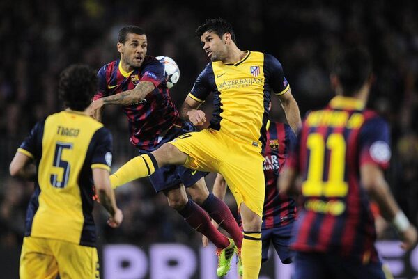 Atletico's Diego Costa, centre challenges for the ball with Barcelona's Daniel Alves, top left during a first leg quarter-final Champions League soccer match between Barcelona and Atletico Madrid at the Camp Nou stadium in Barcelona, Spain, Tuesday April 1, 2014.Manu Fernandez/The Associated Press