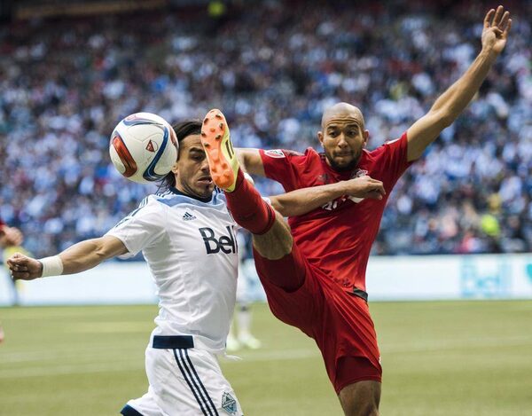 Vancouver FC midfielder Mauro Rosales (7), left, and Toronto FC defender Justin Morrow (2) battle for the ball during the first half of an MLS soccer game in Vancouver, B.C., on Saturday, March 7, 2015.Jimmy Jeong/The Canadian Press