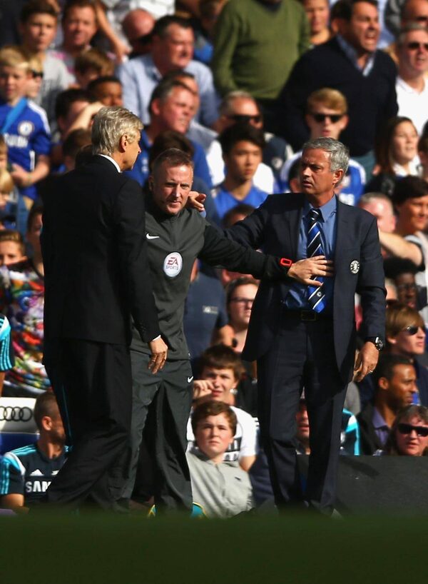 Fourth Official Jonathan Moss comes between Managers Arsene Wenger of Arsenal and Jose Mourinho manager of Chelsea during the Barclays Premier League match between Chelsea and Arsenal at Stamford Bridge on October 4, 2014 in London, England.Paul Gilham/Getty Images