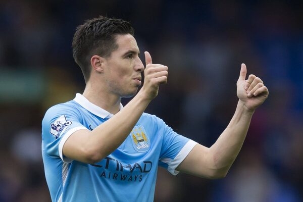 Manchester City's Samir Nasri gives a thumbs up signal to supporters after his team's 2-0 win during the English Premier League soccer match between Everton and Manchester City at Goodison Park Stadium, Liverpool, England, Sunday Aug. 23, 2015.Jon Super/The Associated Press