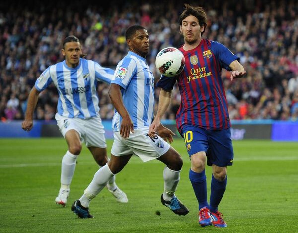 FC Barcelona's Lionel Messi, from Argentina, right, duels for the ball against Malaga's Eliseu Pereira, center, during a Spanish La Liga soccer matchManu Fernandez/The Associated Press