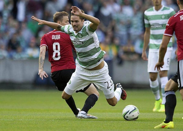 Celtic's Mikael Lustig, right, and Legia Warsaw's Ondrej Duda battle for the ball during their Champions League qualifying soccer match at Murrayfield, Edinburgh, Wednesday Aug. 6, 2014.Jeff Holmes/The Associated Press