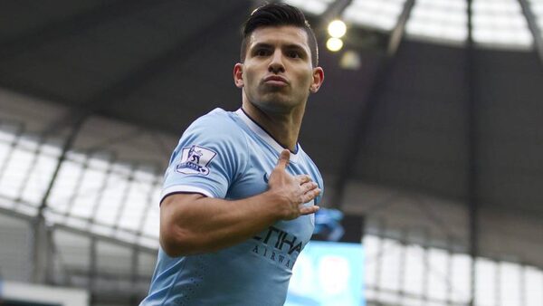 FILE - This is a Saturday Dec. 14, 2013 file photo of Manchester City's Sergio Aguero as he celebrates after scoring against Arsenal during their English Premier League soccer match at the Etihad Stadium, Manchester, England.