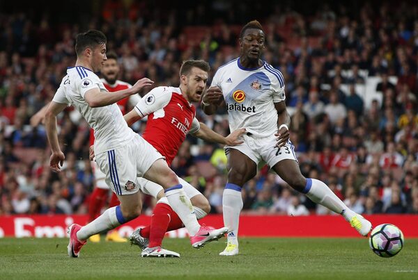 Arsenal’s Aaron Ramsey tries to get the ball away from Sunderland’s Bryan Oviedo and Lamine Koné during Tuesday’s matchup at Emirates Stadium in London.Paul Childs/Reuters