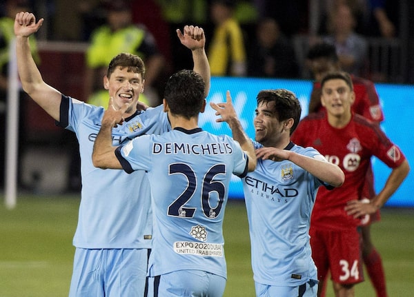 Manchester City midfielder George Evans, left, celebrates his goal with teammate Martin Demichelis while playing against the Toronto FC in Toronto on Wednesday, May 27, 2015.Nathan Denette/The Canadian Press