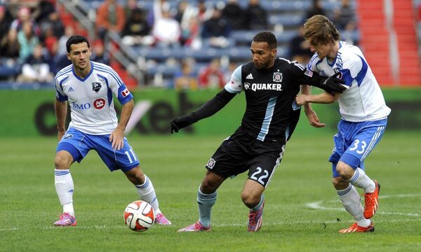 Chicago Fire midfielder Matt Watson (22) fights for a ball with Montreal Impact midfielder Sanna Nyassi (11) and Montreal Impact defender Gorka Larrea (33) in the first half of their game at Toyota Park.Matt Marton