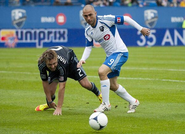 Montreal Impact's Marco Di Vaio (9) breaks away from Sporting Kansas City's Michael Harrington (2) during first half MLS action in Montreal, Saturday, September 22, 2012.Graham Hughes/The Canadian Press