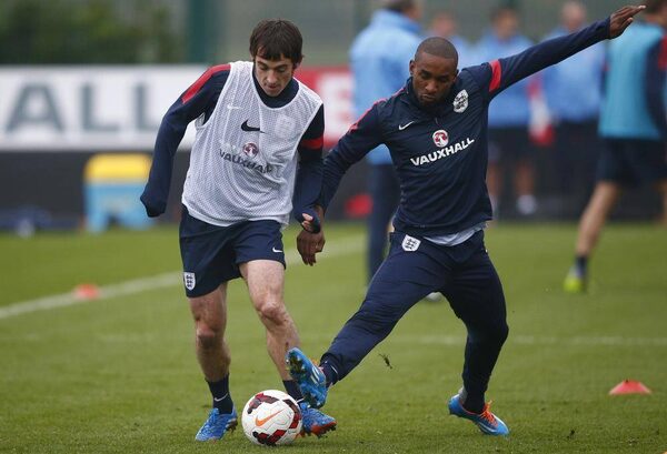 Leighton Baines, left, and Jermaine Defoe fight for the ball during an England team training session at Arsenal's training facility in London Colney, north of London, November 18, 2013. The Daily Mirror has reported that Defoe has agreed to a lucrative four-year deal with Toronto FC.ANDREW WINNING/Reuters