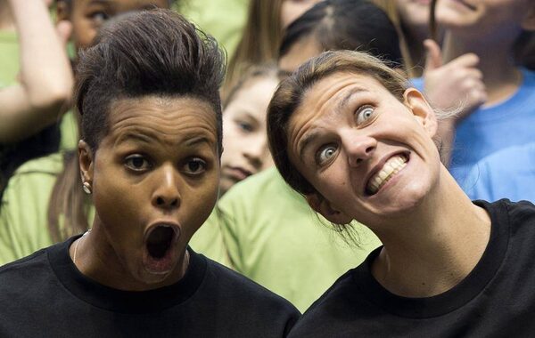 Team Canada's Karina LeBlanc, left, and Christine Sinclair make faces as FIFA unveils the official emblem for the 2015 Women's World Cup soccer tournament during a ceremony in downtown Vancouver, B.C. Friday, December, 14, 2012.Jonathan Hayward/The Canadian Press