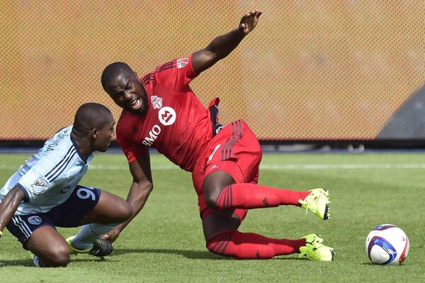 Toronto FC forward Jozy Altidore, right, goes down beside Sporting Kansas City midfielder Jimmy Medranda during first half MLS soccer action in Toronto on Saturday, August 8, 2015.Frank Gunn/The Canadian Press