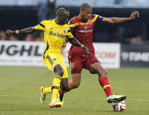 Columbus Crew forward/midfielder Dominic Oduro battles with Real Salt Lake defender Chris Schuler for the ballBarbara J. Perenic/The Associated Press