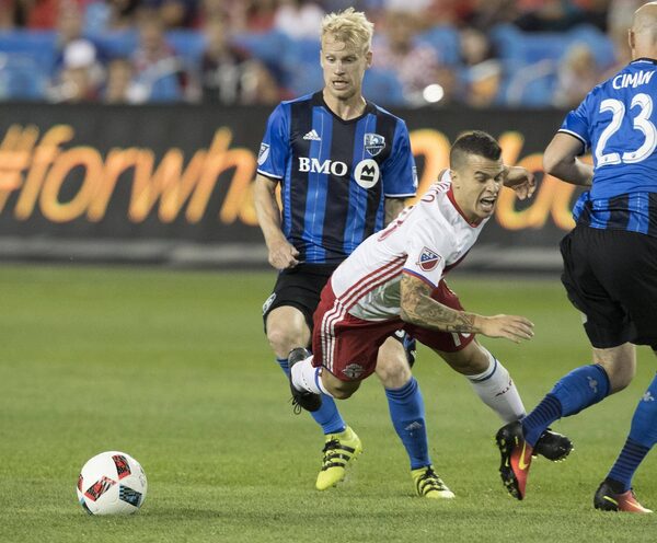Toronto FC's Sebastian Giovinco (10) is taken down during a game against Montreal Impact in Toronto, August 27, 2016.Fred Thornhill/The Canadian Press