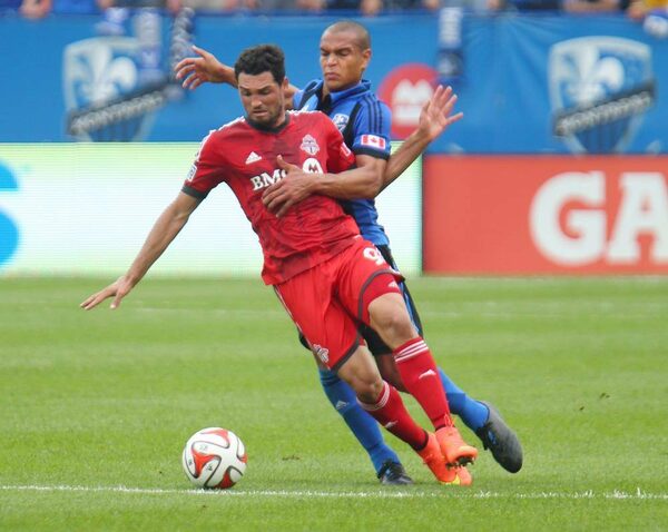 Toronto FC forward Gilberto and Montreal Impact defender Matteo FerrariJean-Yves Ahern