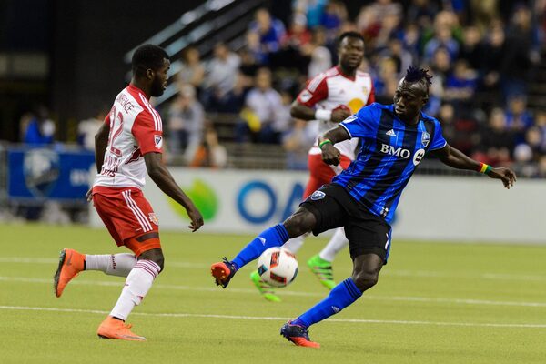 Dominic Oduro #7 of the Montreal Impact kicks the ball near Kemar Lawrence #92 of the New York Red Bulls during the MLS game at the Olympic Stadium on March 12, 2016 in Montreal, Quebec, Canada. The Montreal Impact defeated the New York Red Bulls 3-0.Minas Panagiotakis/Getty Images
