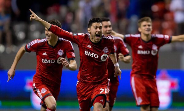 Toronto FC's Jonathan Osorio and his teammates celebrate after defeating the Vancouver WhitecapsThe Canadian Press