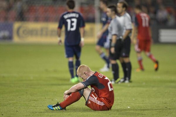 Toronto FC 's Richard Eckersley slumps to the floor after his team's 2-1 home defeat to Chicago Fire in MLS action in Toronto on Wednesday September 12, 2012.Chris Young/The Canadian Press