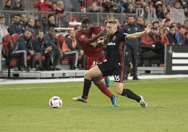 D.C. United midfielder Rob Vincent (26) battles for a ball with Toronto FC midfielder Amando Cooper (31) during the first half in a game at BMO Field on Saturday, Oct. 1, 2016.Nick Turchiaro