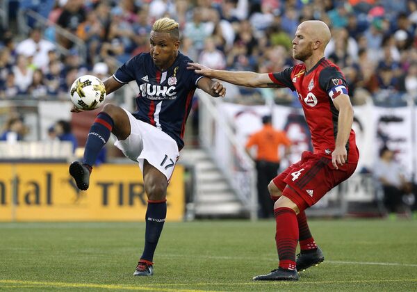New England Revolution forward Juan Agudelo controls the ball next to Toronto FC midfielder Michael Bradley on Sept. 23, 2017.Winslow Townson