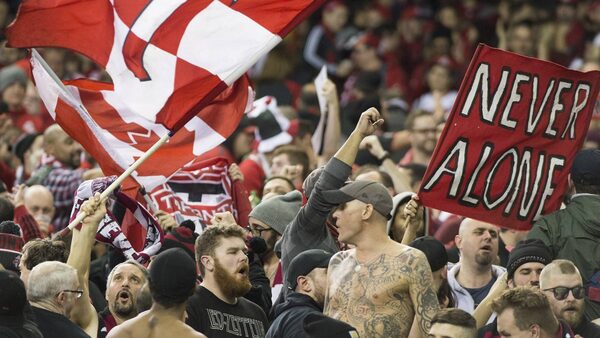 Toronto FC fans cheer on their team prior to the first leg of the MLS Eastern Conference final against the Montreal Impact at the Olympic Stadium in Montreal, Tuesday, November 22, 2016.