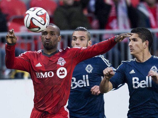 Toronto FC forward Jermain Defoe moves the ball past Vancouver Whitecaps defenders in Toronto on Wednesday, May 7, 2014. TFC’s star off-season acquisitions Defoe and Michael Bradley scored both TFC goals in the first leg of the Amway Canadian Championship semi-final.Nathan Denette/The Canadian Press