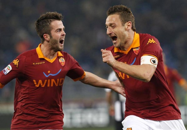 AS Roma's Francesco Totti (R) celebrates with teammate Miralem Pjanic after scoring against Juventus during their Italian Serie A soccer match at the Olympic stadium in Rome February 16, 2013.STEFANO RELLANDINI/Reuters